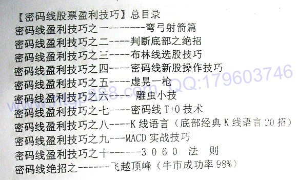 文字资料:(七套) 1为复印实物资料.其它均为电子版 1.密码线盈利技巧(40页复印实物资料) 2.《短线点金》精华本-弯弓射箭篇 3.徐文明深度技术辅导视频文稿资料 4.徐文明短线点金投资技巧高级资料 5.《密码线股票操作技术》 6.《密码线股票投资技巧》 7.短线点金1-4册(高清晰PDF格式)